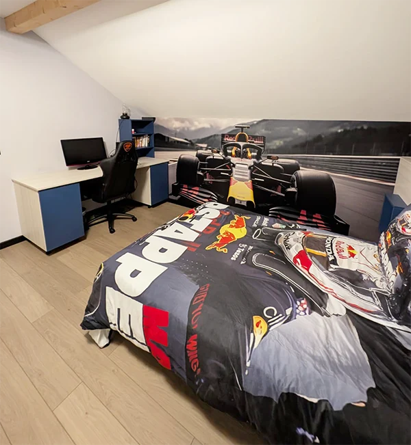 Aménagée en sous pente, cette chambre d’adolescent fan de Formule 1 révèle un agencement optimisé.